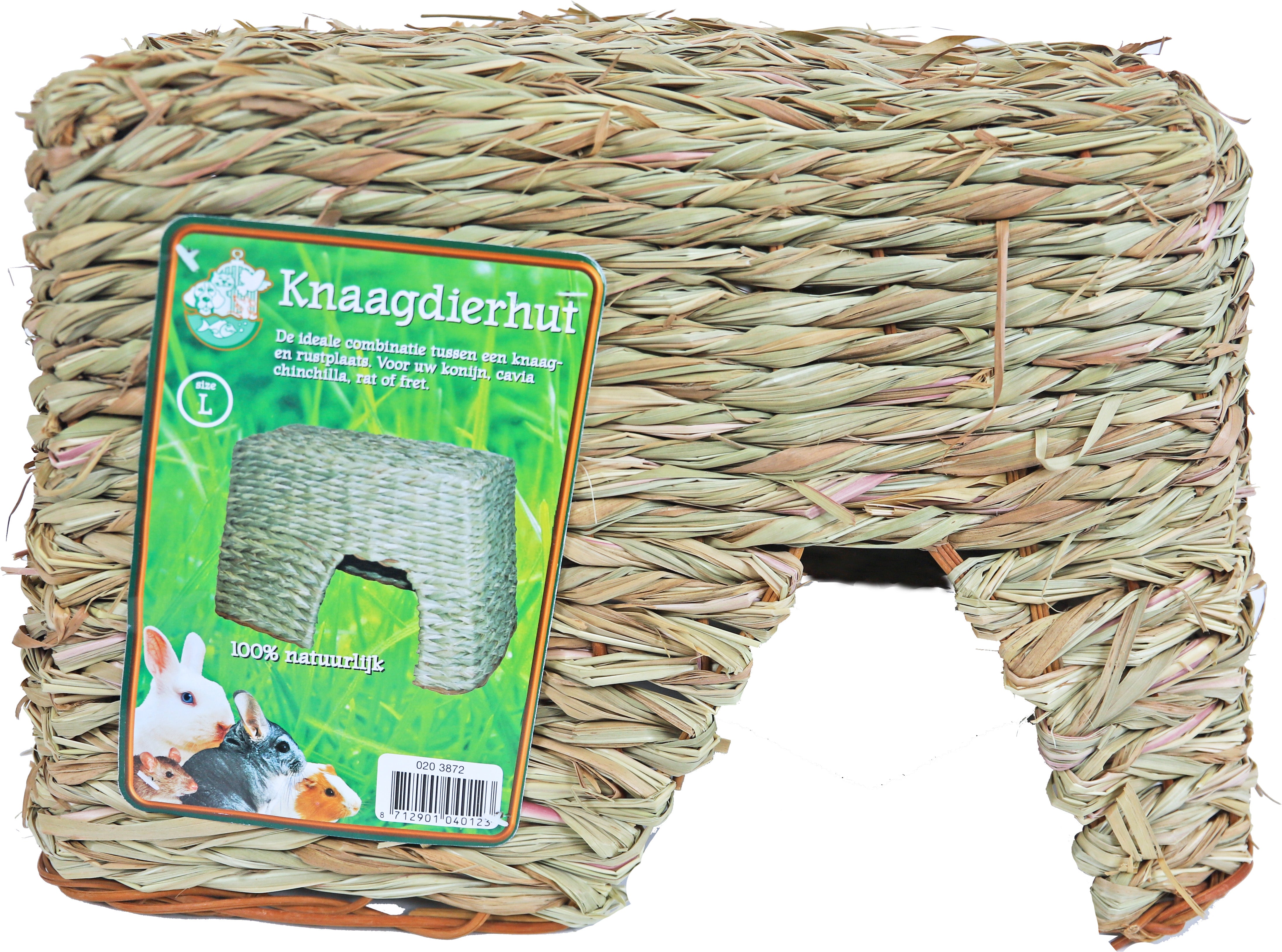 De Knaagdierhut Large ist ein 100% natürlicher Unterschlupf, perfekt für Kaninchen, Meerschweinchen, Chinchillas und andere Nagetiere. Hergestellt aus natürlichem Gras bietet diese Hütte einen sicheren und komfortablen Ruheplatz, während das Material sicher zum Nagen ist.