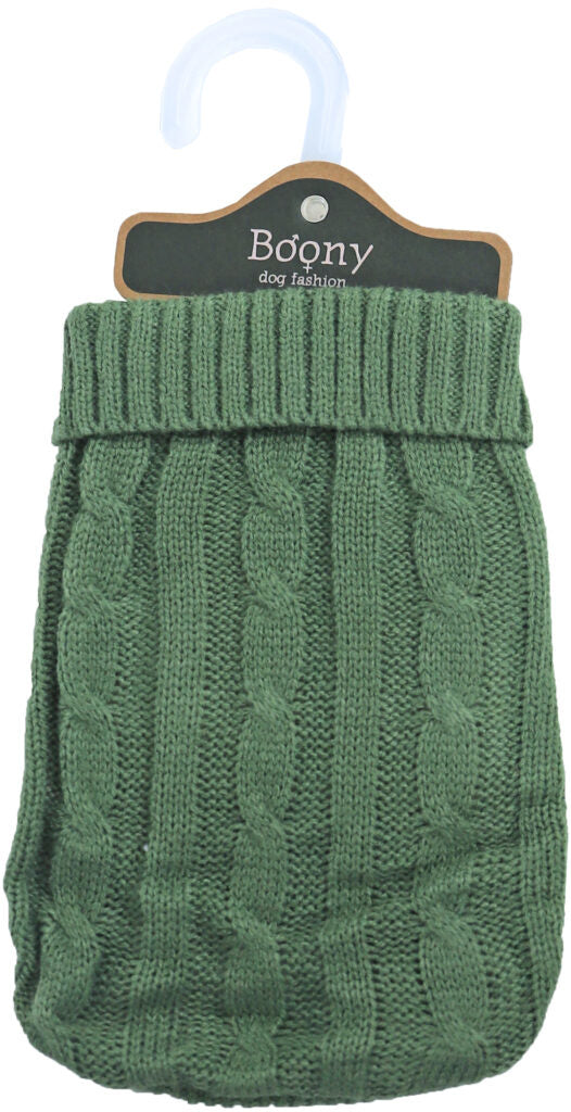 Dieser olivgrüne Strickpullover von Boony ist eine stilvolle und bequeme Wahl für deinen Hund an kalten Tagen. Die offene Struktur sorgt für Belüftung, während das weiche Material eine angenehme zusätzliche Wärmeschicht bietet. Perfekt für winterliche Spaziergänge oder gemütliche Momente zu Hause.