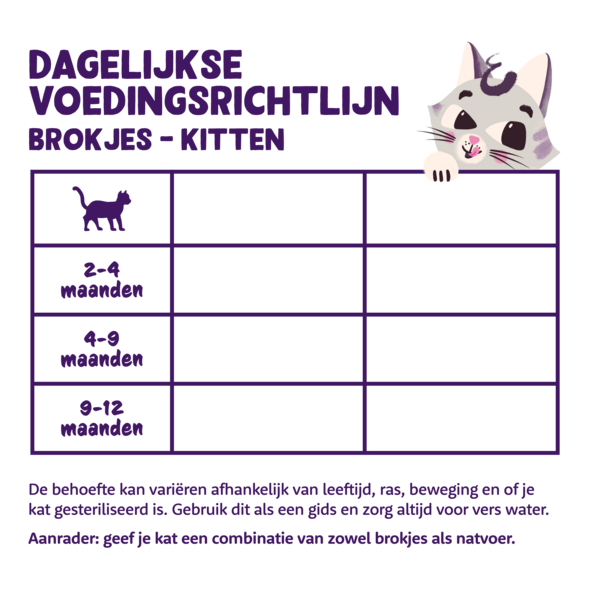 Nährstoffzusätze/kg: Vitamin A 20.000 IE, Vitamin D3 1750 IE, Vitamin E 250 mg, Zink (Zinksulfat, Monohydrat) 100 mg, Eisen (Eisen(II)sulfat-Monohydrat) 70 mg, Jod (Calciumjodat, wasserfrei) 1,5 mg, Kupfer (Kupfer(II)sulfat-Pentahydrat) 10 mg, Mangan (Mangan(II)sulfat, Monohydrat) 30 mg, Taurin 1500 mg, DL-Methionin 3000 mg.