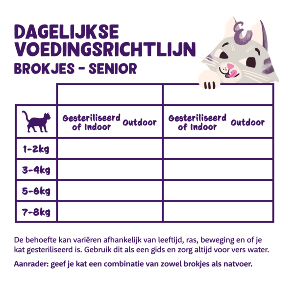 Nährstoffzusätze/kg: Vitamin A 20.000 IE, Vitamin D3 1750 IE, Vitamin E 250 mg, Zink (Zinksulfat, Monohydrat) 100 mg, Eisen (Eisen(II)sulfat-Monohydrat) 70 mg, Jod (Calciumjodat, wasserfrei) 1,5 mg, Kupfer (Kupfer(II)sulfat-Pentahydrat) 10 mg, Mangan (Mangan(II)sulfat, Monohydrat) 30 mg, Taurin 1500 mg, DL-Methionin 3000 mg, L-Carnitin 150 mg.