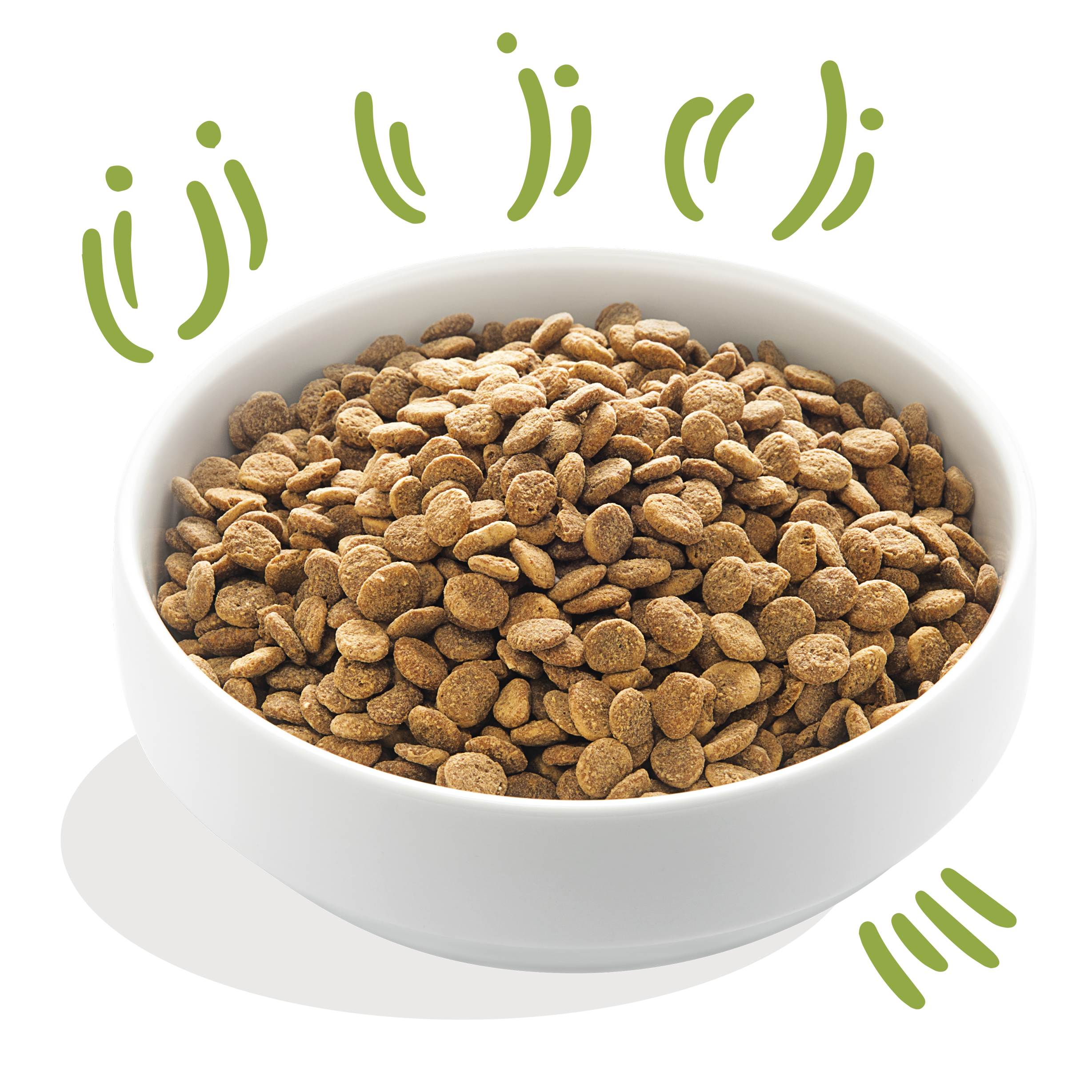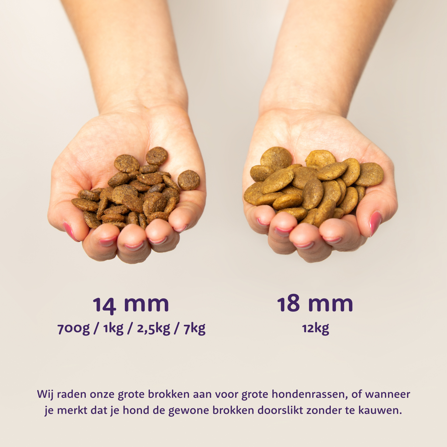 Die ersten drei Größen enthalten Brocken mit einer Größe von 14 Millimetern. Die 12-kg-Säcke enthalten Brocken mit einer Größe von 18 mm – besonders geeignet für große Hunderassen oder Hunde, die dazu neigen, ihr Futter zu schlucken, ohne zu kauen.