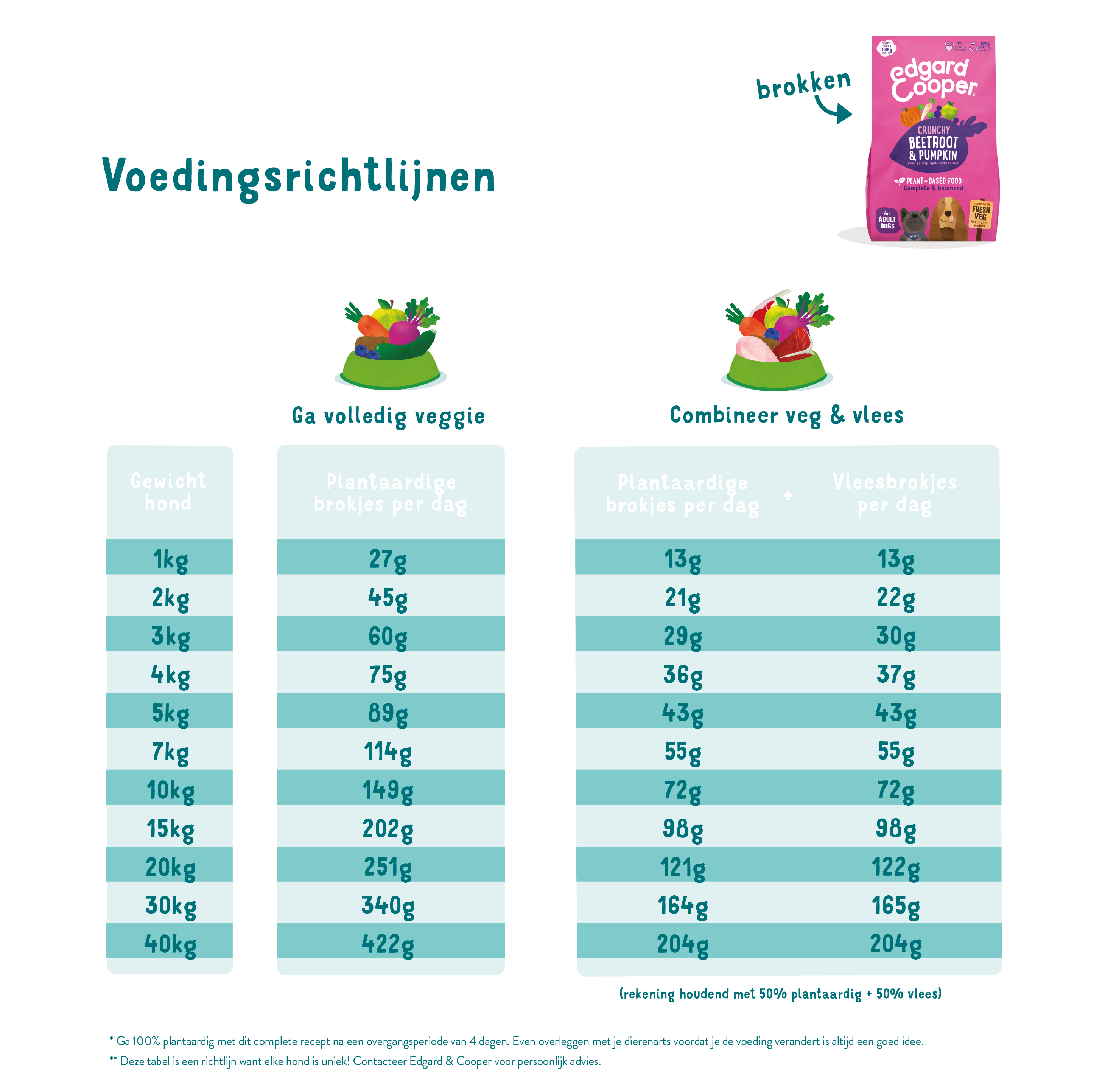 Vegetarische Kroketten mit pflanzlichen Proteinen, Aminosäuren und Vitamin B12. Mit frischem Gemüse und frischem Obst wie Roter Bete, Kürbis, Erbsen, Pastinake, Apfel und Holunderbeeren. Enthält alle notwendigen Nährstoffe für deinen Hund.