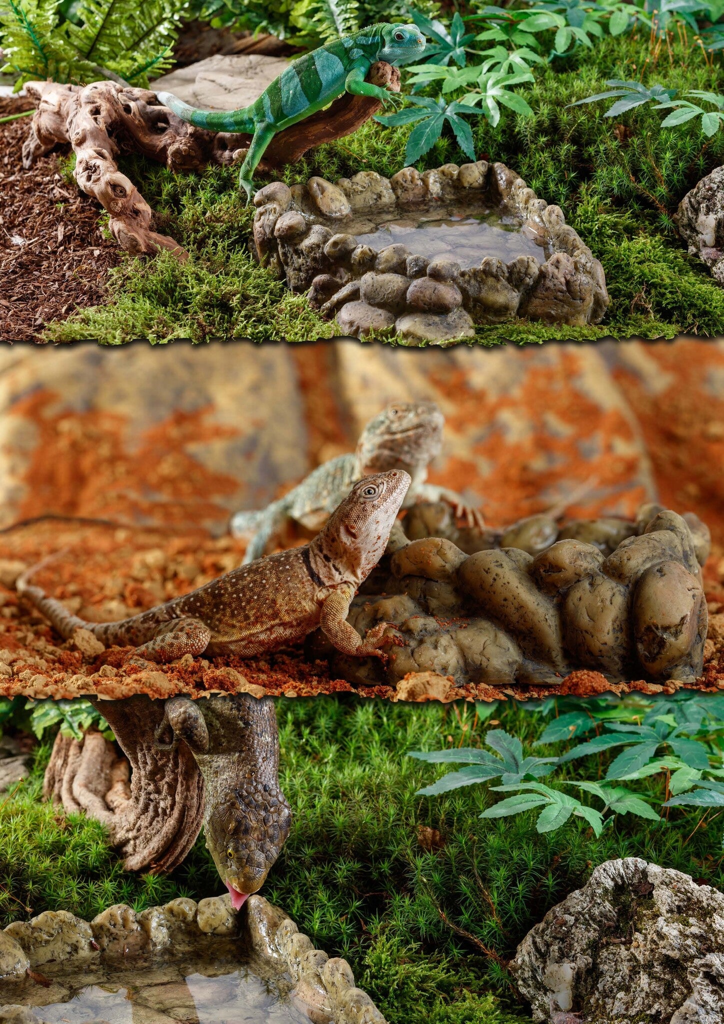 Bieten Sie täglich frisches und sauberes Wasser an! Behandeln Sie Leitungswasser immer mit Wasseraufbereiter, um schädliche Schwermetalle und Chlor zu entfernen. Verbessern Sie den Nährwert des Trinkwassers, indem Sie flüssigen Elektrolyt und Calcium hinzuzufügen, um ein gesundes Knochen- und Muskelwachstum bei Ihren Reptilien und Amphibien zu unterstützen. Das Becken ist leicht zu reinigen, das lebensmittelechte Harz verhindert die Entwicklung schädlicher Bakterien.
