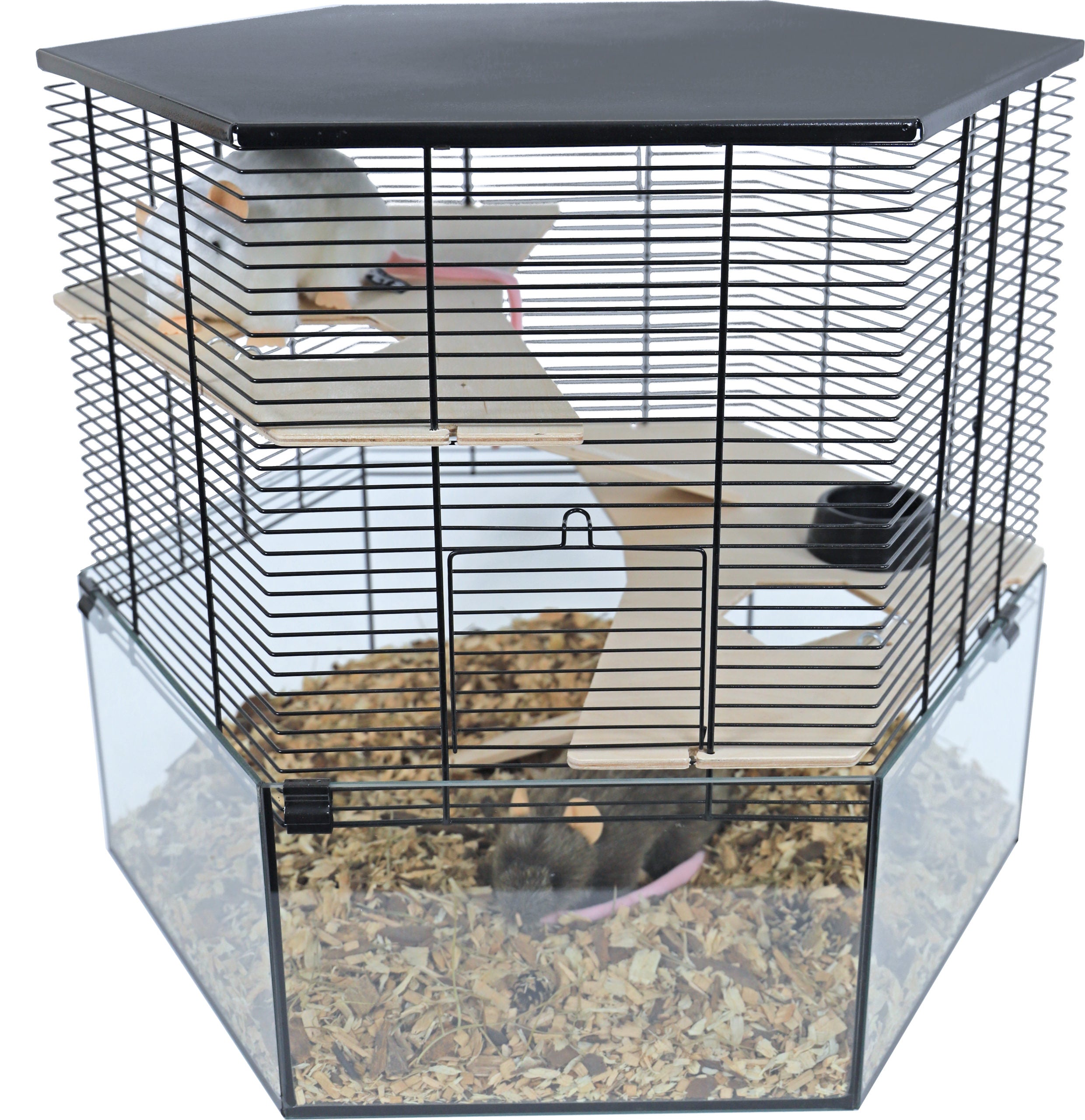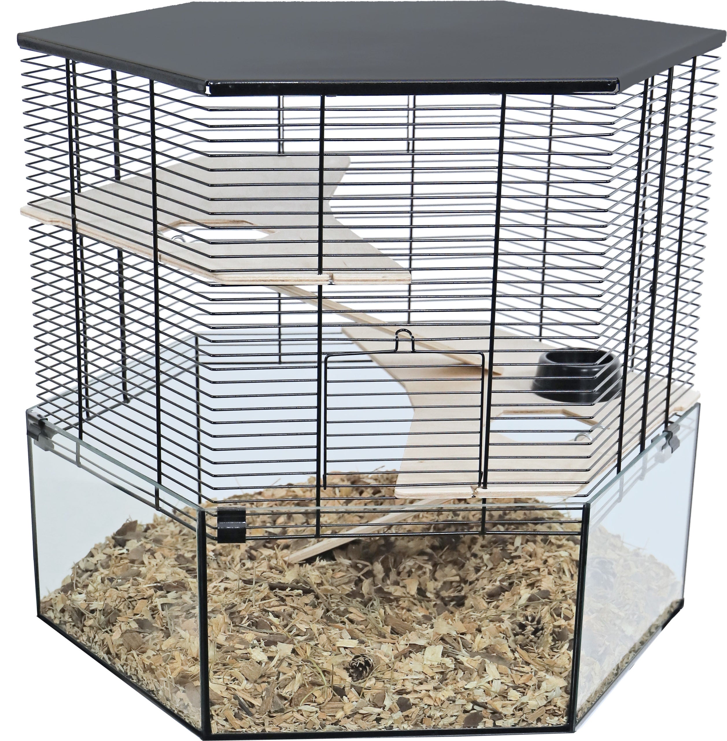 Dieser geräumige Hamsterkäfig kombiniert eine moderne, achteckige Form mit einem stabilen Glasunterteil. Perfekt für eine übersichtliche und hygienische Lebensumgebung für Ihren Hamster. Das Glasunterteil bietet ausreichend Platz für Einstreu und verhindert Unordnung außerhalb des Käfigs.