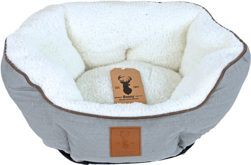 De Boony Est 1941 Mand Highland Grey bietet einen sicheren und komfortablen Schlafplatz für deinen Hund oder deine Katze. Dank des weichen Kunstschaffells fühlt sich der Korb wunderbar warm an, perfekt zur Entspannung. Das elegante Design in Grau und Weiß fügt sich mühelos in jedes Interieur ein.
