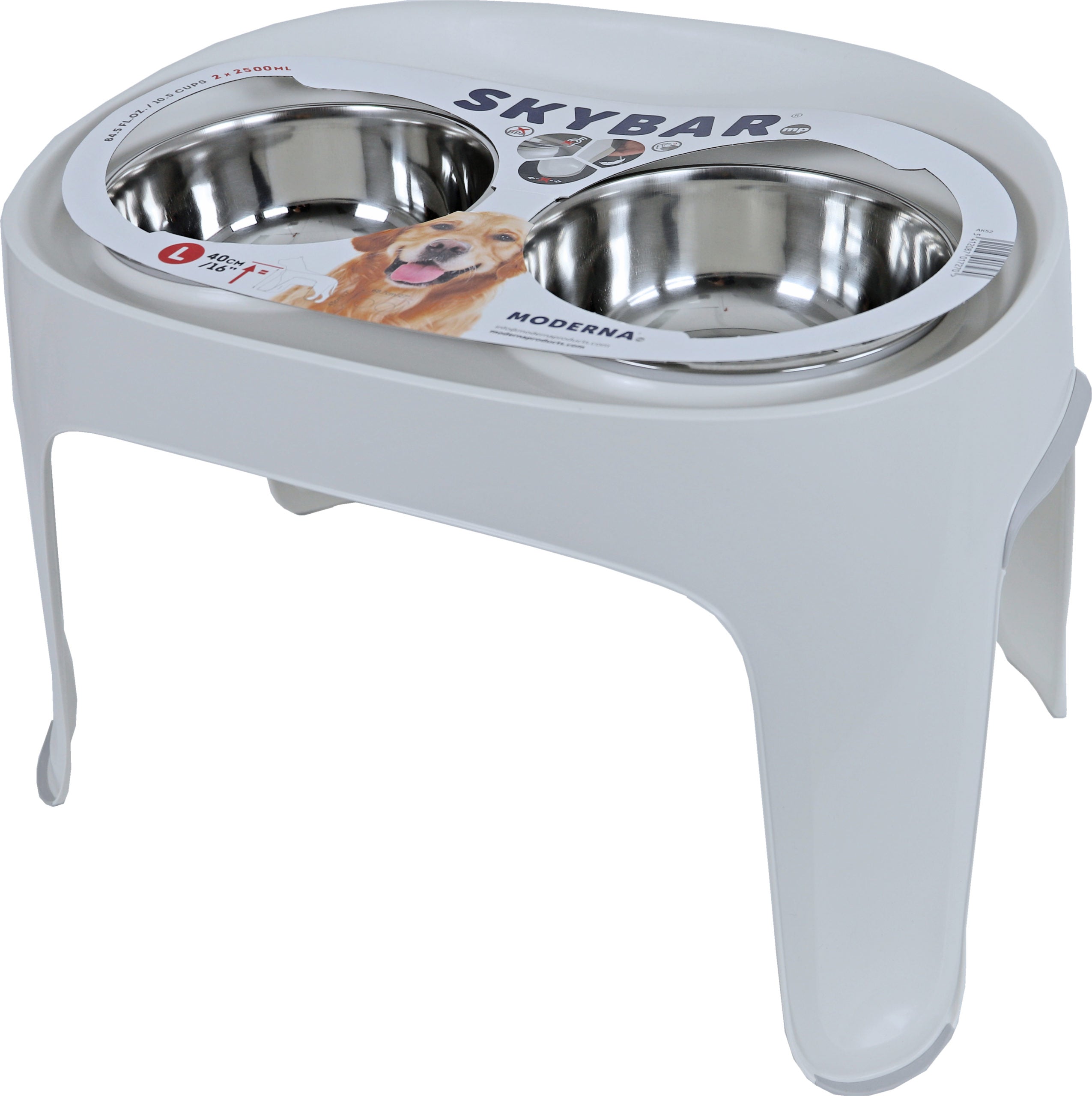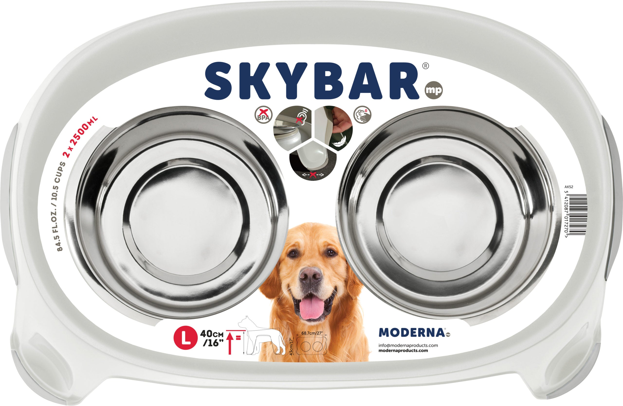 Der Moderna Skybar doppelte Futterständer wurde für ein komfortables und ergonomisches Esserlebnis entwickelt. Mit rutschfesten Füßen und geräuschdämpfenden Edelstahl-Schalen bleibt der Ständer fest an seinem Platz, während dein Haustier das Essen und Trinken ohne störende Geräusche genießt.