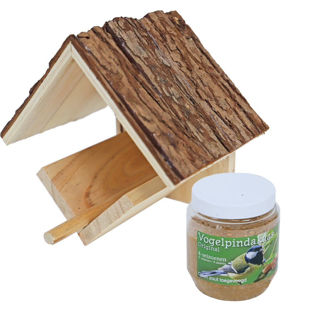 Süßes Holzhaus mit passendem Erdnussbuttertopf. Füttern Sie hungrige Gartenvögel im Winter mit einem leckeren Erdnussbuttersnack.