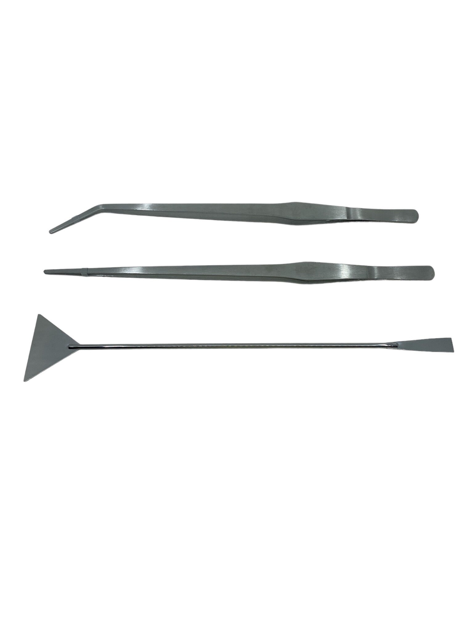 Die gebogene Schere und die gebogene Pinzette gelangen in die schwierigen Ecken eines Aquariums oder (Aqua)Terrariums.