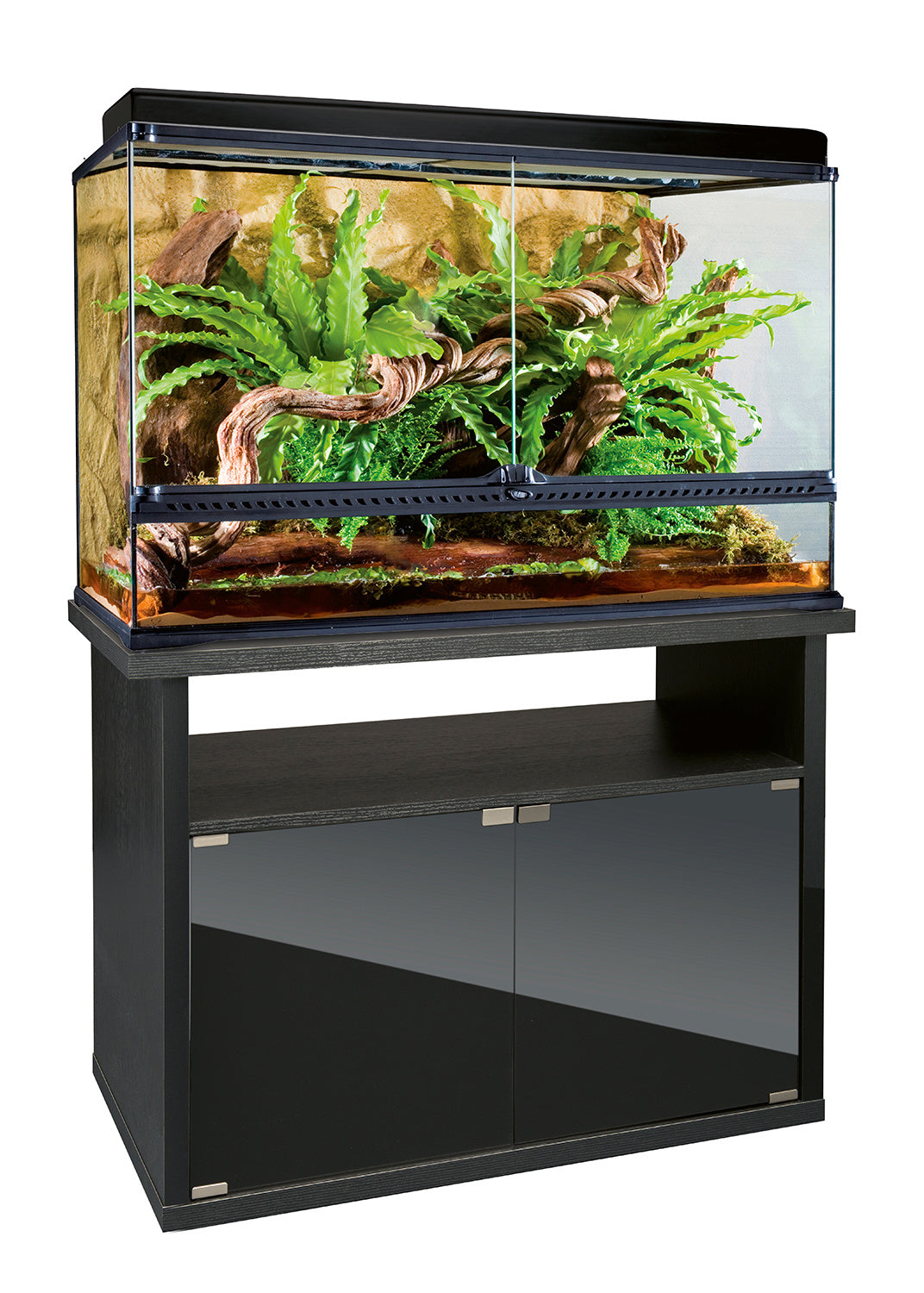 Zu diesem Terrarium gehört ein moderner und eleganter Schrank, der Stabilität und Langlebigkeit bietet. Die schwarzen Glastüren mit Magnetschlössern sorgen für ein schlankes, stilvolles Aussehen und sind einfach zu bedienen. Der Schrank wird flach verpackt geliefert und ist leicht zu montieren, sodass du schnell deine neue Terrarium-Ausstattung genießen kannst.