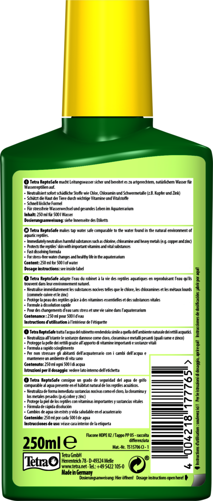 Tetra Reptosafe 250ml Machen Sie Leitungswasser mit Tetra Reptosafe sicher für Schildkröten Reptrosafe neutralisiert schädliche Stoffe im Leitungswasser. Für gesundes... Lesen Sie mehr