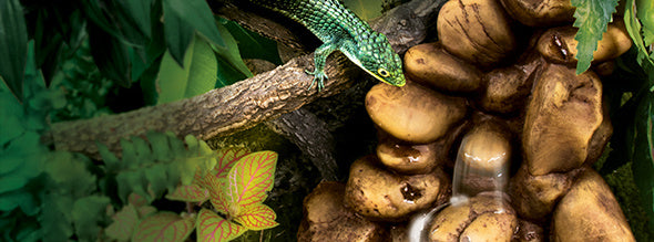 Der Wasserfall ist mit einer Pumpe ausgestattet und erzeugt einen stufenweisen Wasserstrom. Das fließende Wasser fördert das natürliche Trinkverhalten von Echsen wie Chamäleons, Anolen und Wasseragamen.